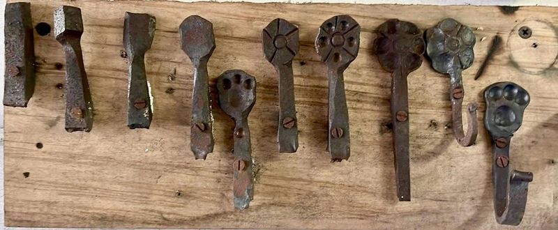 Michael taught his approach to forge a hook with a flower end. He has made a lot of these to hold a trivet collection. Since he started, the process has gone through many iterations and he showed the last one.