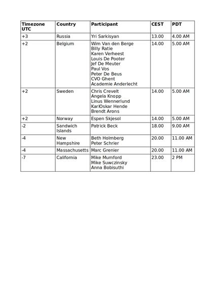 Here the schedule of the participants. We included the Timezone, the country and what 14.00 (2 PM) at the local time is in CEST and PDT. You can use this link to timeanddate.com, to help you calculate your own watching time. All the participants locations have been added.